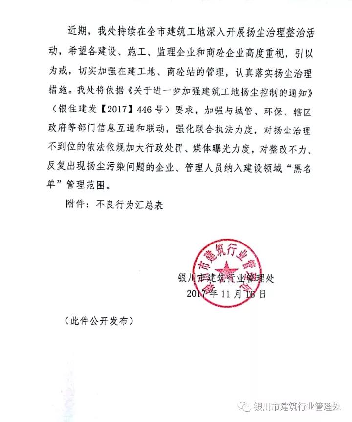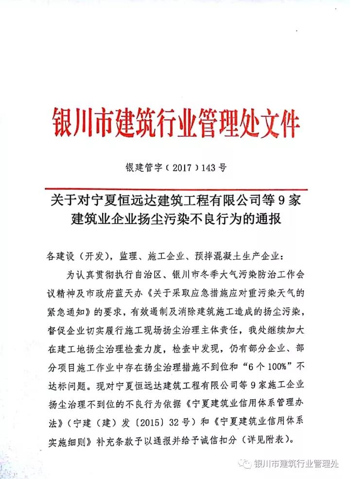 關(guān)于對寧夏恒遠(yuǎn)達(dá)建筑工程有限公司等9家建筑業(yè)企業(yè)揚塵污染不良行為的通報