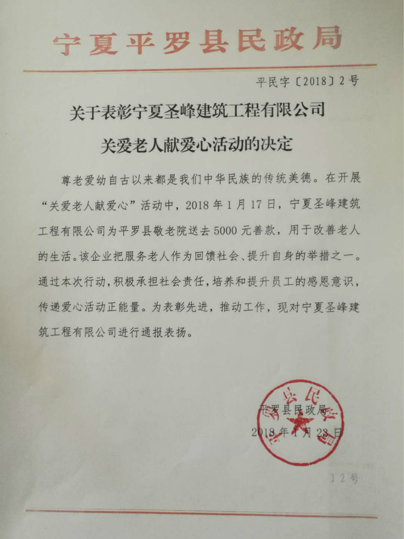關(guān)愛老人獻愛心,寧夏圣峰建筑工程有限公司回報社會為平羅縣敬老院送去善款