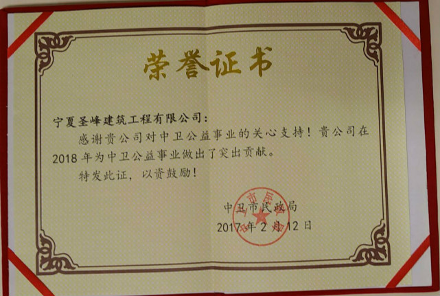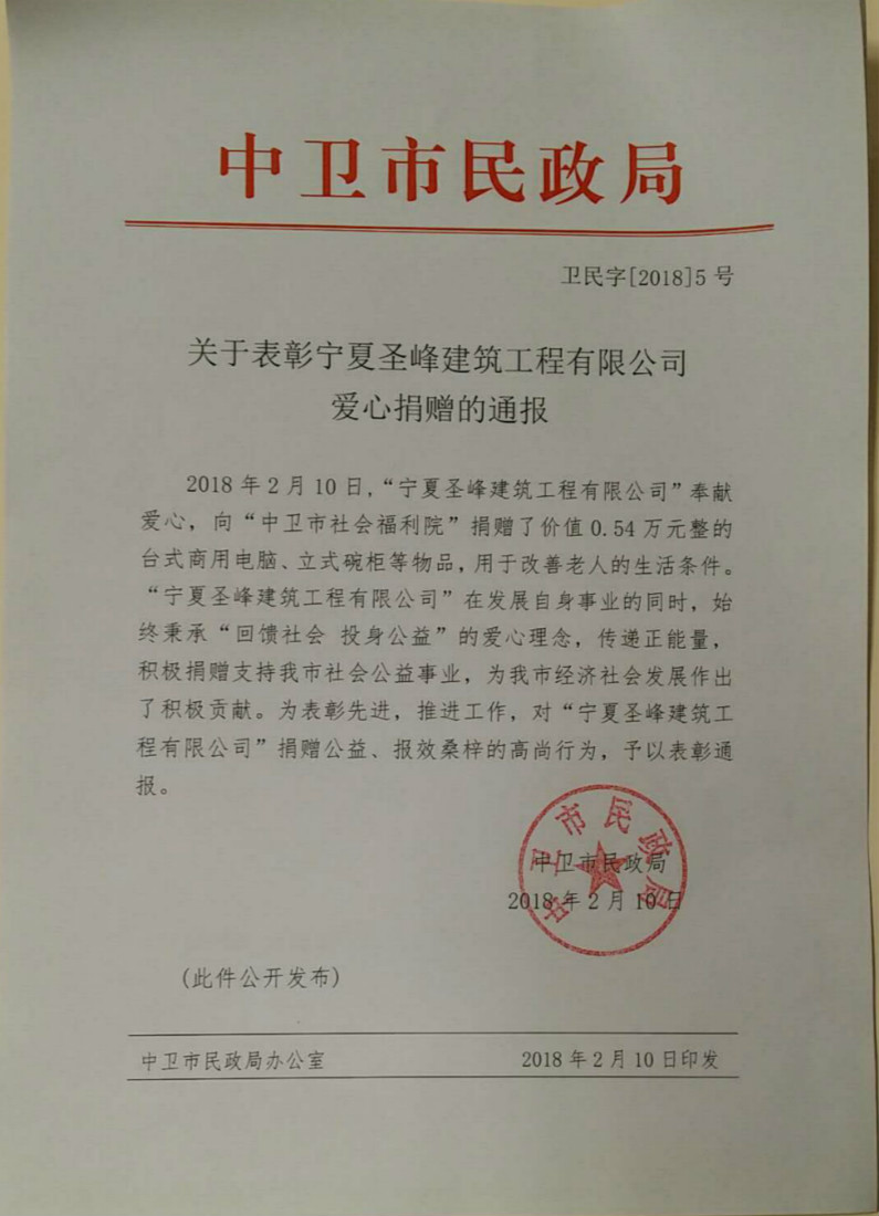 回饋社會(huì)、投身公益,2018年2月10日寧夏圣峰建筑工程有限公司向中衛(wèi)市社會(huì)福利院捐贈(zèng)物資