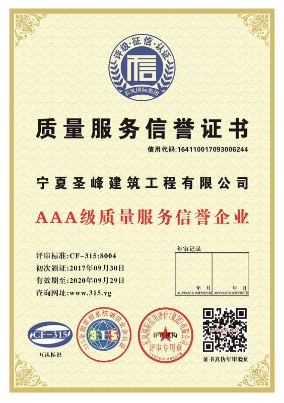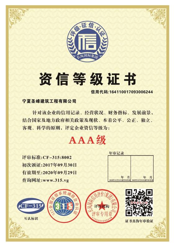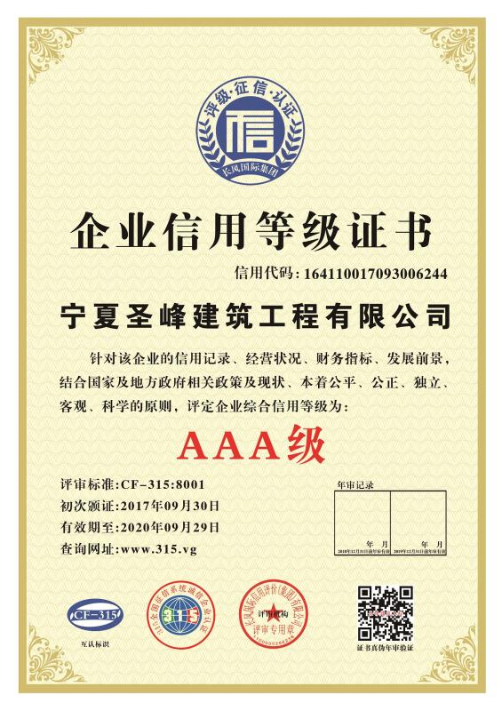 寧夏圣峰建筑工程有限公司AAA級信用企業(yè)